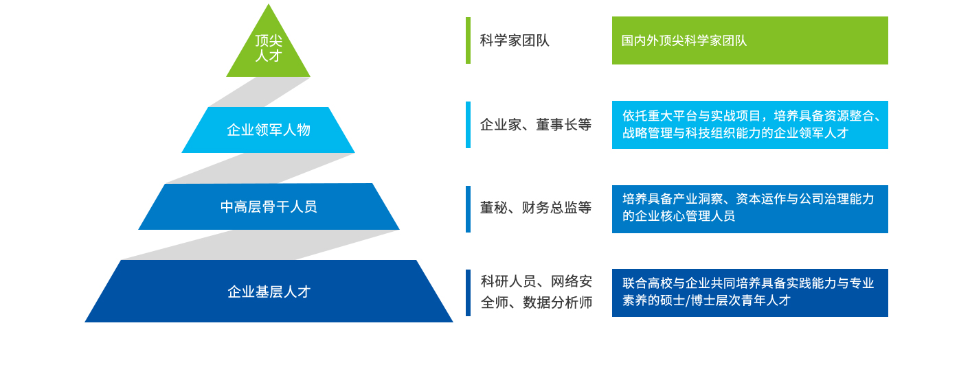 研究院致力于构建一个多层次、全周期、深度融合的人才生态体系,通过顶尖科学家引领创新,企业领军驱动产业,中高层骨干支撑战略执行,并夯实基层人才基础,构建覆盖“战略-管理-实战”的全链条体系。